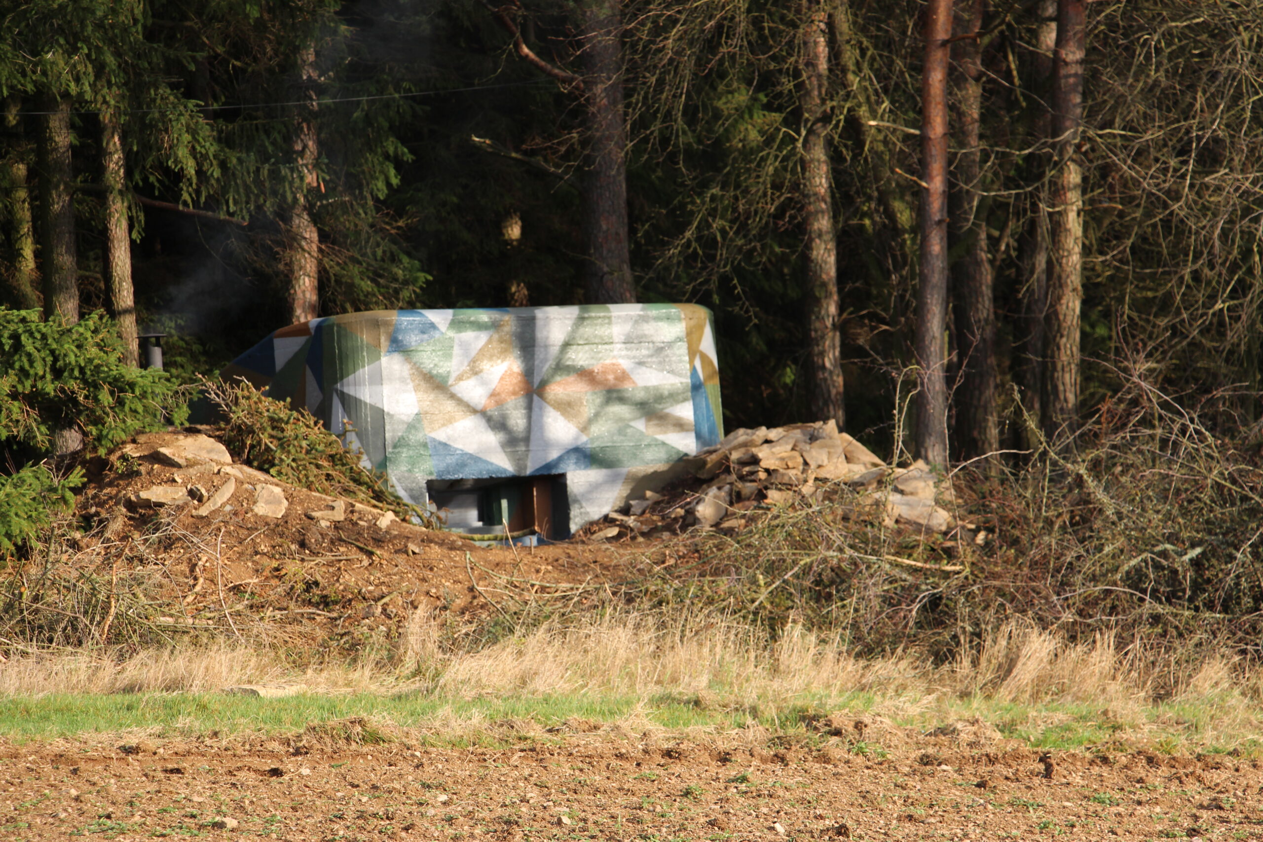Po příjezdu na vyznačené parkoviště podle mapy jsme si vybalili věci a vydali se na zhruba 600 metrů dlouhou cestu lesem. Jedná se o lesní cestu, ale není se čeho obávat. Mapu jsme si předem prohlédli na webu a šli víceméně intuitivně. Navíc jsou po cestě na stromech umístěny čtyři směrové tabulky, takže máte jistotu, že jdete správným směrem. Poslední úsek vede do kopce a na jeho vrcholu už uvidíte svůj bunkr, barevně odlišený od okolní krajiny. (*Za zmínku stojí i možnost objednat si čtyřkolku, kterou najdete v nabídce na webu ubytování.)