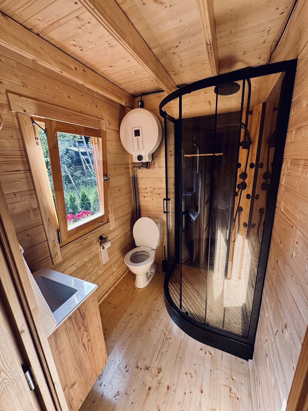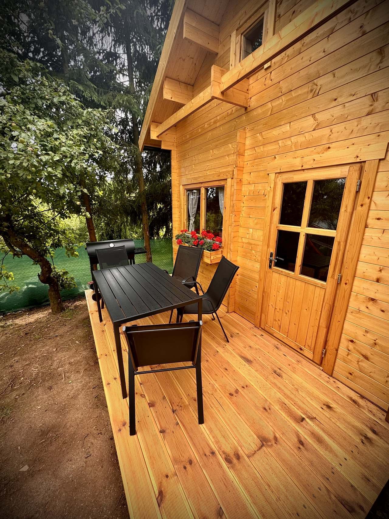 Uprostřed pozemku stojí celodřevěná chata o rozměrech přibližně 5 × 5 metrů. Před ní se nachází terasa s posezením a grilem, ideální pro letní grilování. Právě z terasy se vstupuje dovnitř. V přízemí vás čeká prostorný obývací pokoj s kuchyňským koutem, který je plně vybavený – od nádobí a nožů až po vše potřebné ke stolování. Nechybí ani menší koupelna se sprchovým koutem a toaletou.